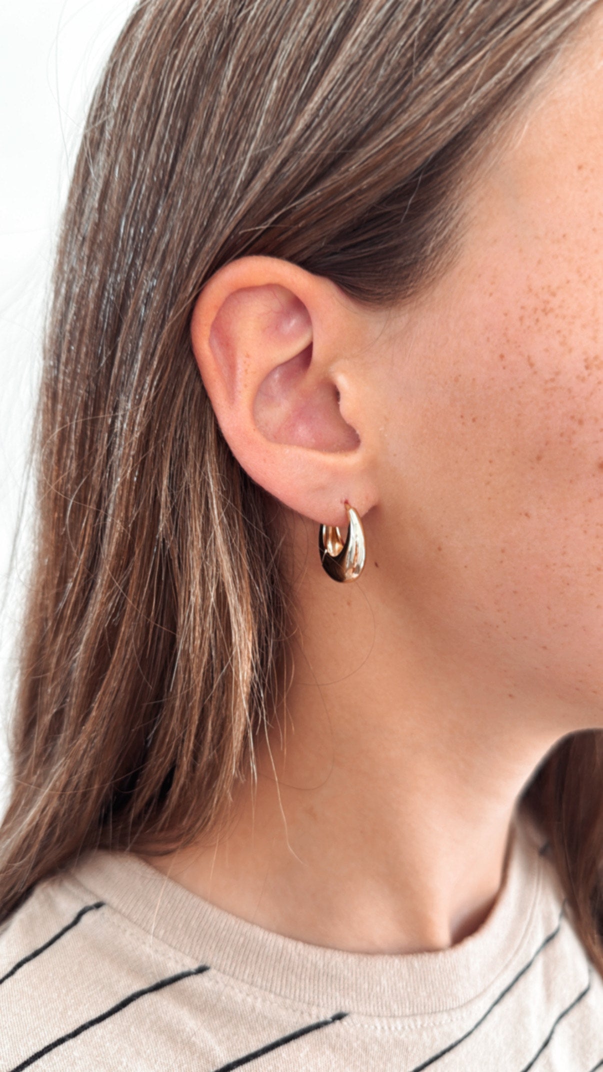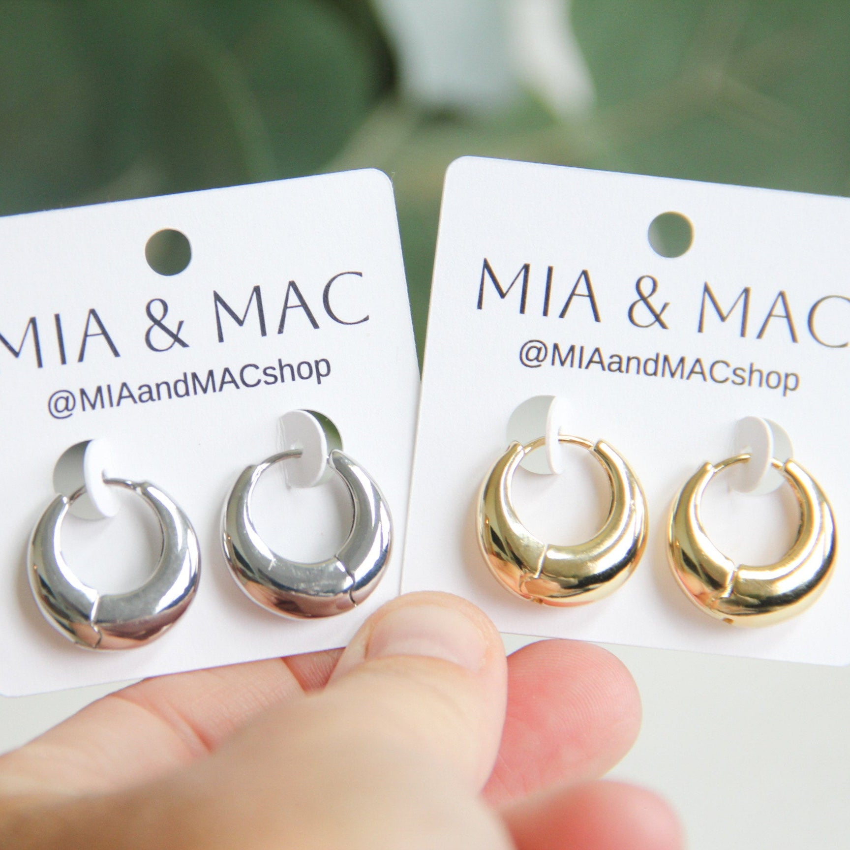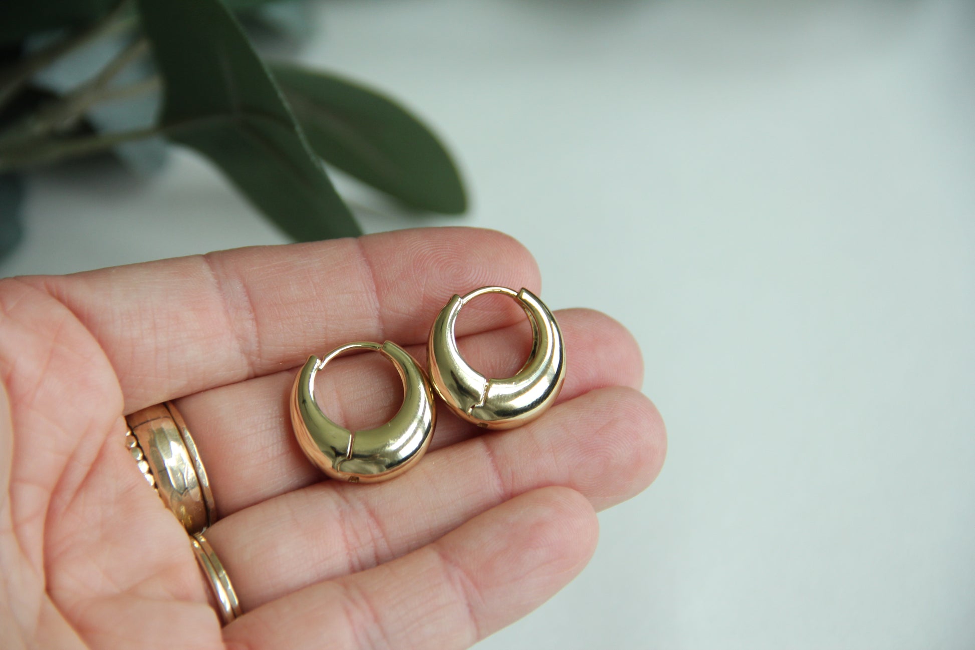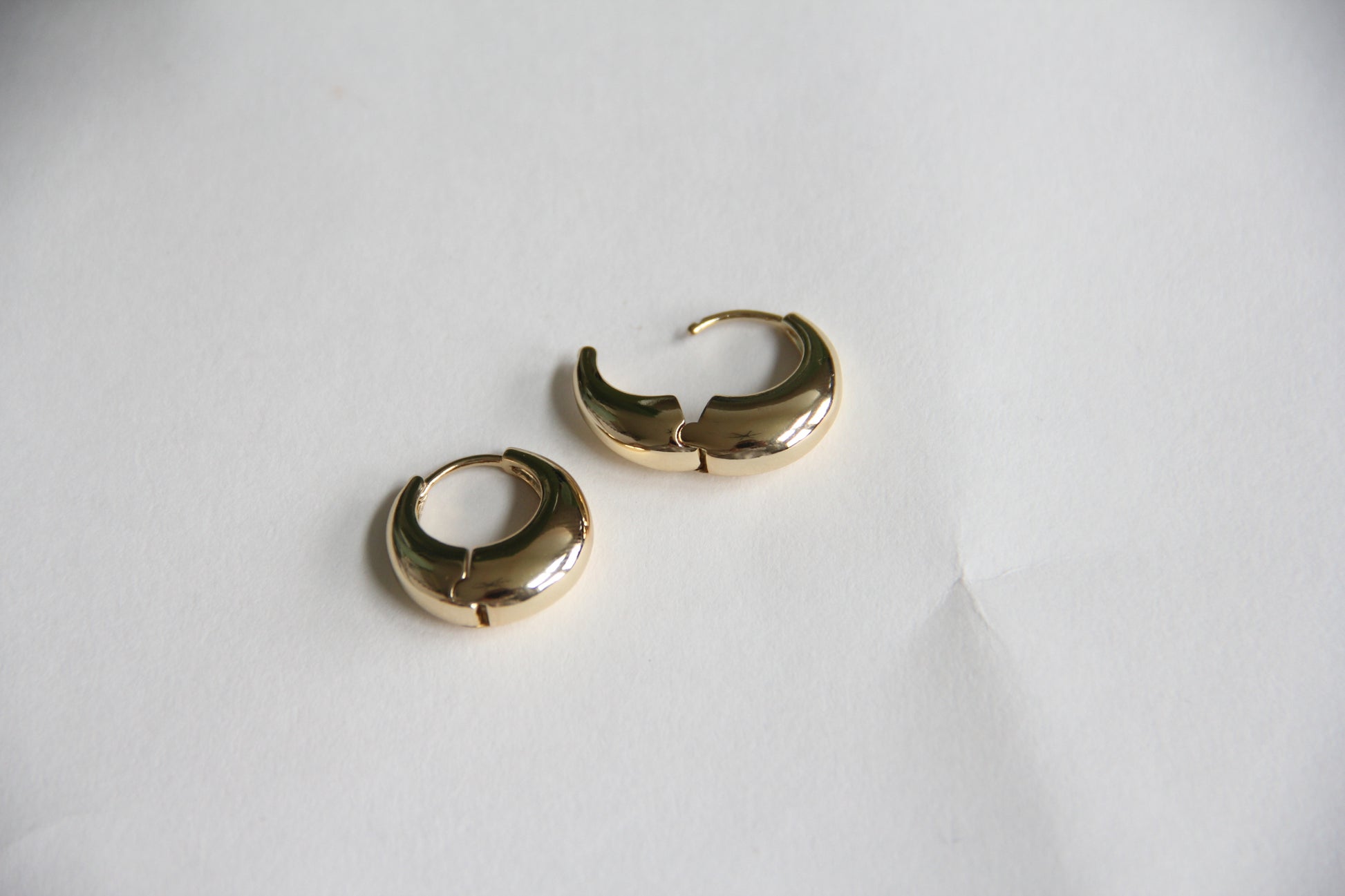 Chubby Dome huggies in Gold or Silver Huggies. These huggies have a hinge at the bottom and make them snap on and off and are lightweight. They are perfect for every day and don't fall out easily.
